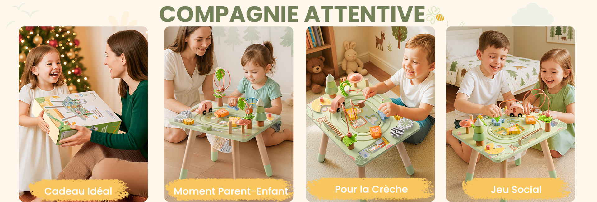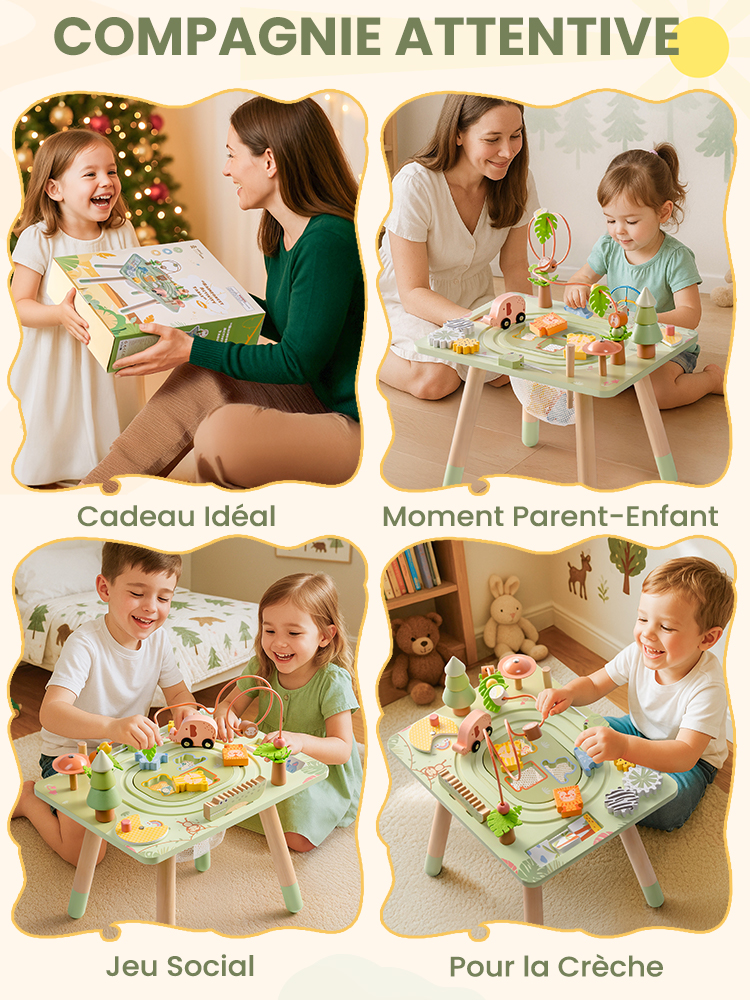 Soutient le Jeu Indépendant : Cette table d'activités en bois encourage l'exploration et le jeu indépendants. En proposant des activités stimulantes à un rythme adapté à l'enfant, elle favorise l'indépendance, renforce la confiance en soi et promeut la résolution de problèmes et l'apprentissage autodirigé.