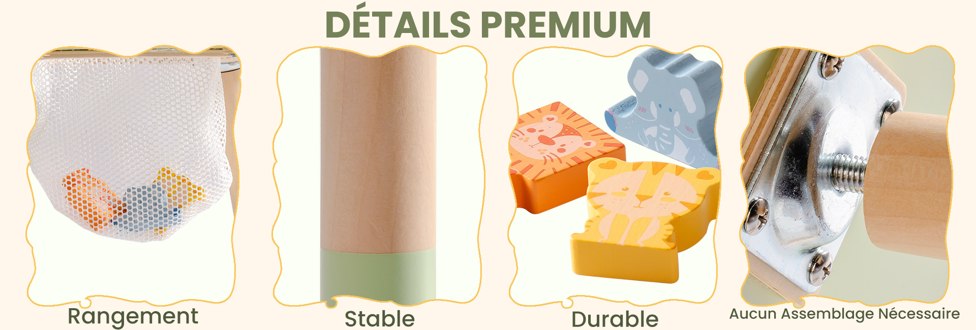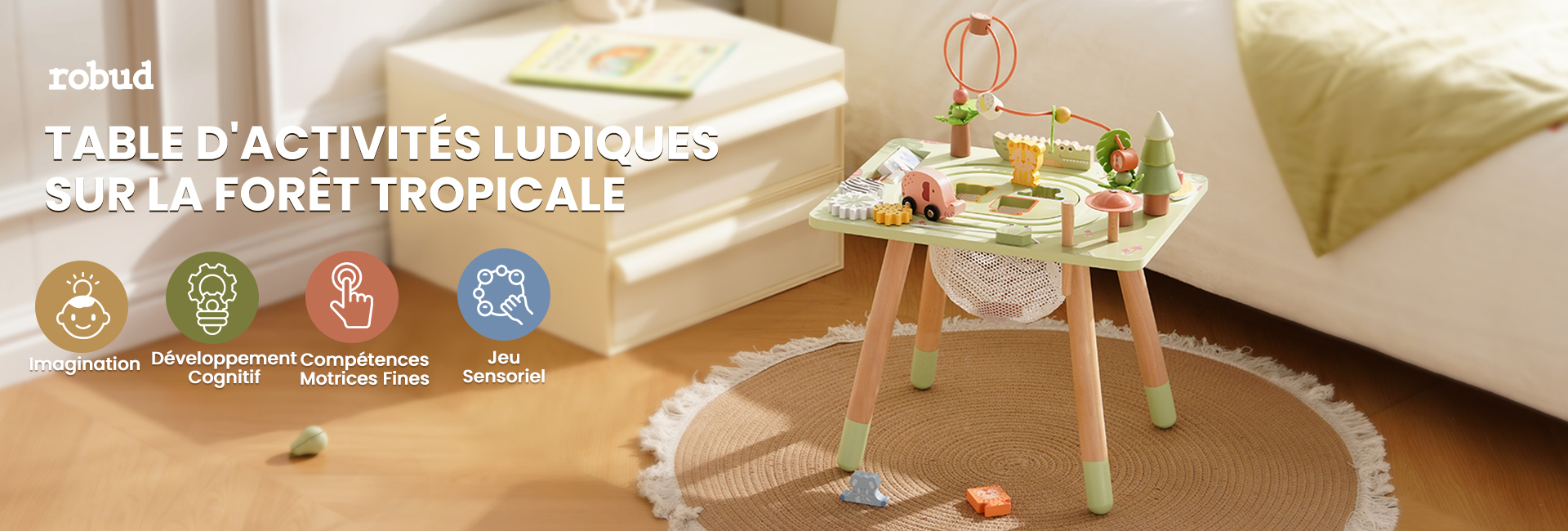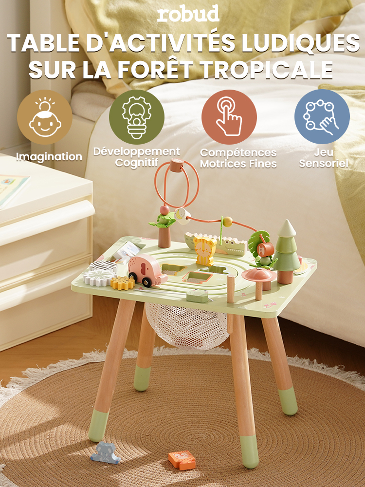 Design Montessori : Cette table d'activités, adaptée aux tout-petits de 1 à 3 ans, encourage l'apprentissage pratique et le jeu interactif. Des activités comme le tri de formes et les Perles de Forêt Tropicale améliorent les compétences motrices fines et la coordination œil-main, favorisant la résolution de problèmes et le développement cognitif.