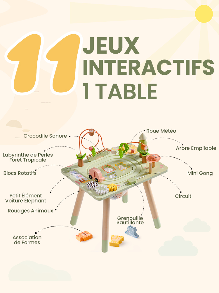 11-en-1 Table d'Activités : Cette table d'apprentissage propose 11 activités : Engrenages Animaux, Grenouille Sauteuse Mobile, Petit Gong, Arbre Empilable, Girouette Météo, Crocodile Sonore, Blocs Tumble, Chariot Éléphant Bébé, Piste, Correspondance de Formes, et Perles de Forêt Tropicale. Elle est parfaite pour développer les compétences motrices fines, le développement cognitif et la créativité, offrant une expérience d'apprentissage pratique et amusante qui encourage l'exploration et le développement par le jeu.