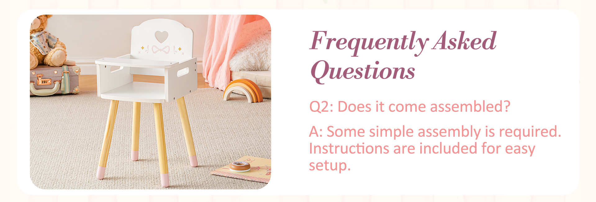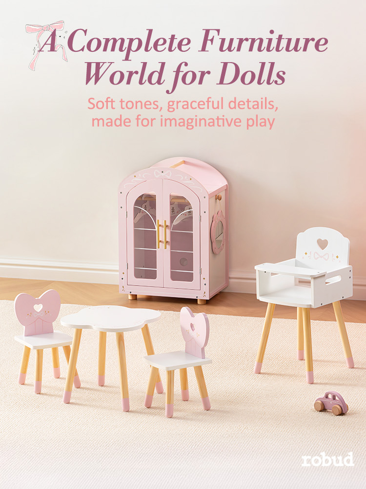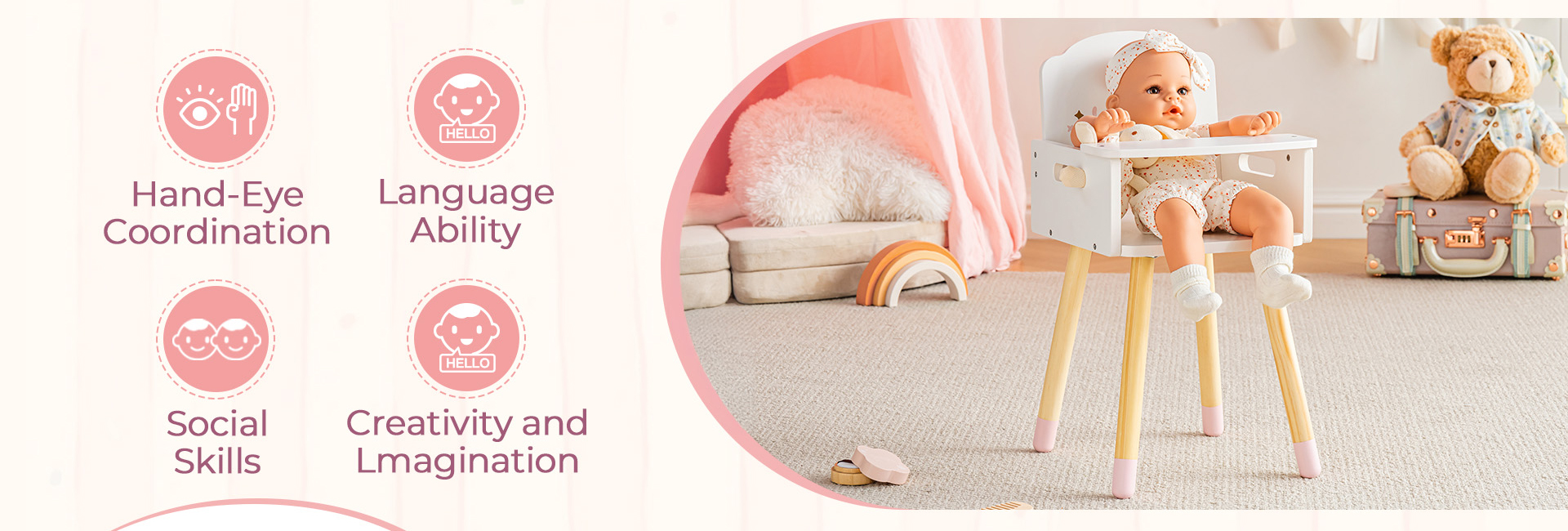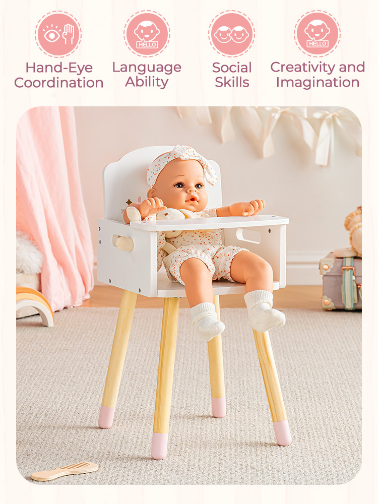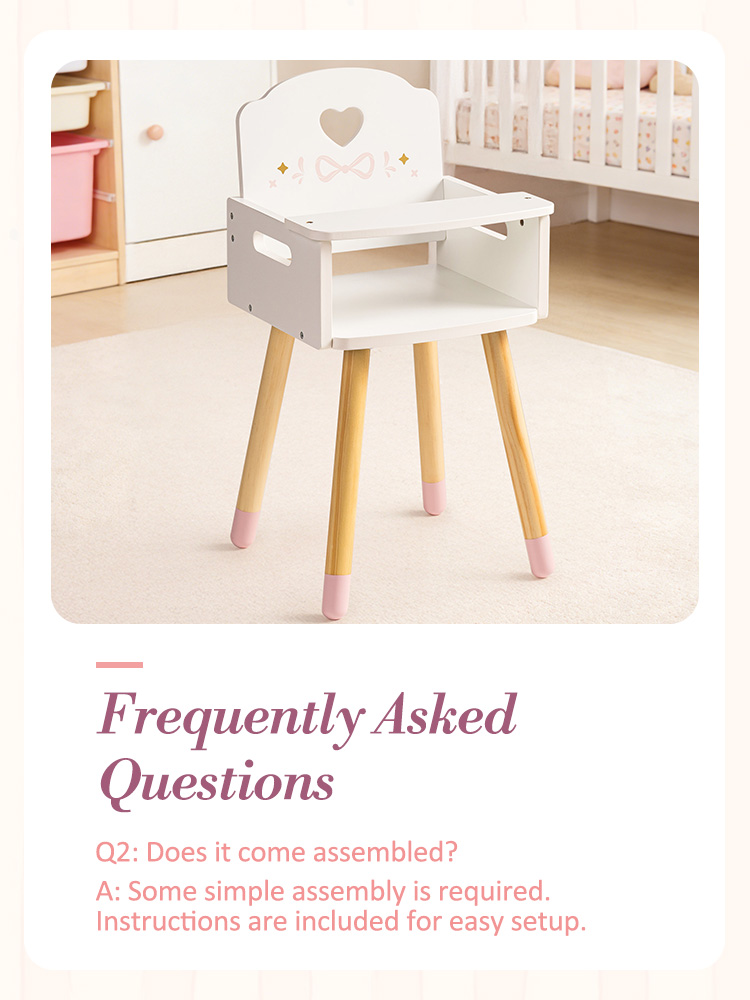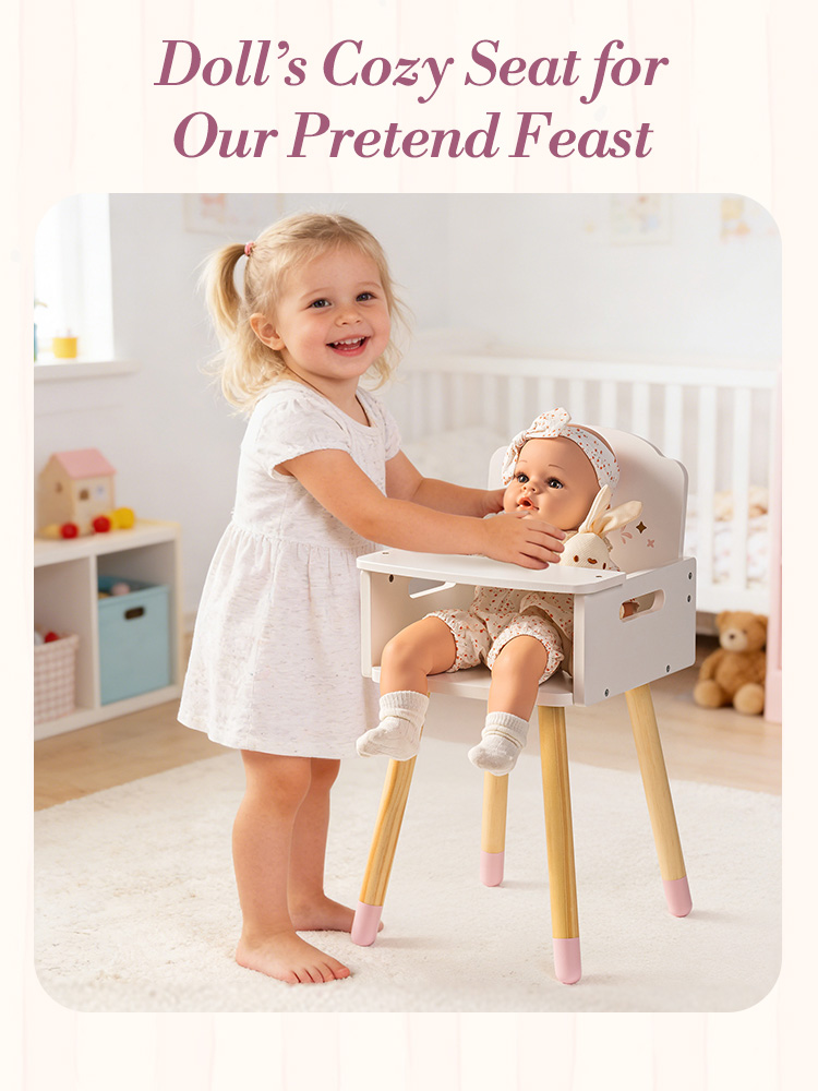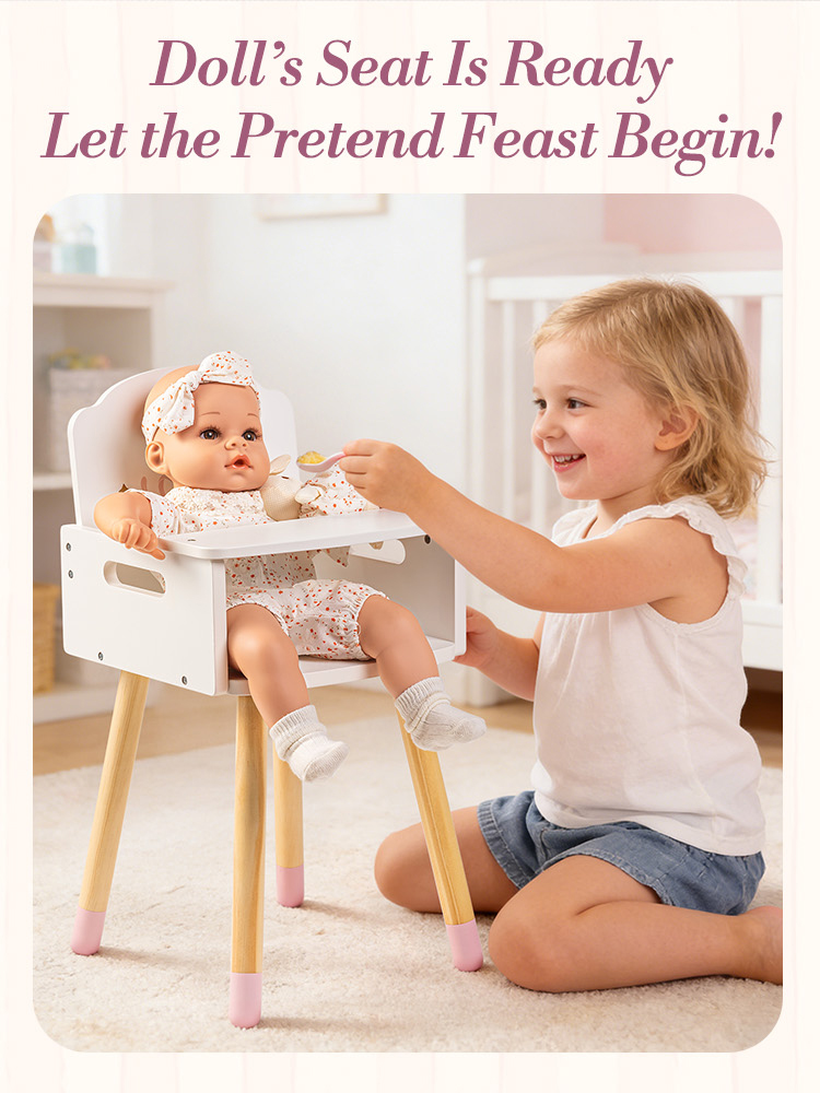 - Artisanat en bois massif et assurance de jeu sûr--Fabriquée en bois massif de haute qualité, chaque partie de cette chaise haute pour poupée est sans éclats, protégeant doucement les petites mains pendant le jeu. Les coins arrondis évitent les coups accidentels, tandis que les jambes en bois robustes garantissent que la chaise haute pour poupée reste stable pour de longues heures de jeu joyeux.