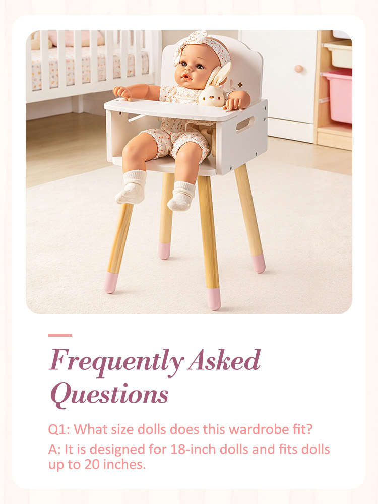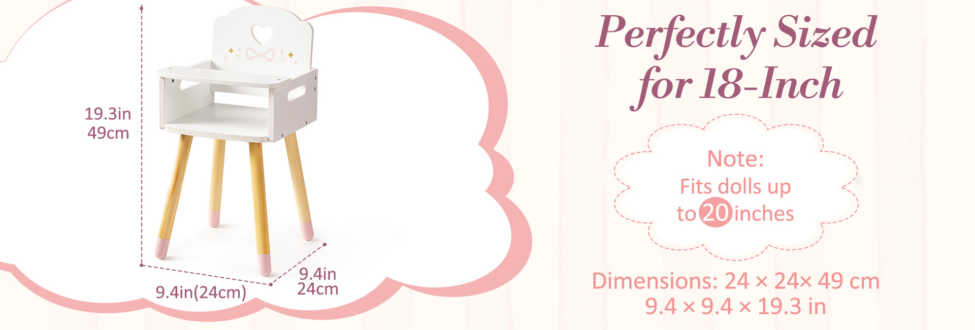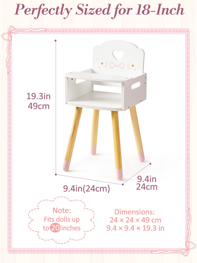 - Taille parfaite pour un plaisir de jeu sans fin avec les poupées--Mesurant 24×24×49 cm (9.4×9.4×19.3 in), cette chaise haute pour poupée convient aux poupées jusqu'à 20 pouces. En tant que jouet de chaise haute pour bébé conçu pour les enfants de 3 ans et plus, c'est plus qu'un simple jouet—c'est une porte d'entrée vers des soins imaginatifs avec leurs poupées bien-aimées, et n'est pas destiné aux vrais nourrissons.