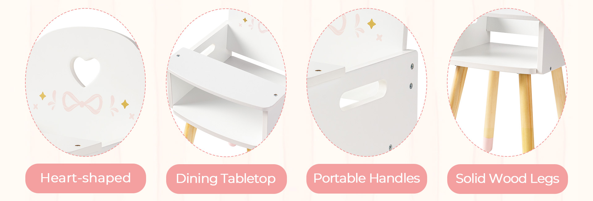 - Détails réalistes charmants et nettoyage sans tracas--Inspirée des vraies chaises de salle à manger, cette chaise haute pour poupée est remplie de détails doux et réalistes qui rendent le jeu de rôle aussi authentique que possible : un dossier en forme de cœur, un plateau de nourriture rabattable et une table dédiée. La surface de la chaise haute pour poupée se nettoie en quelques secondes avec un chiffon humide, éliminant les tracas du rangement après le jeu.