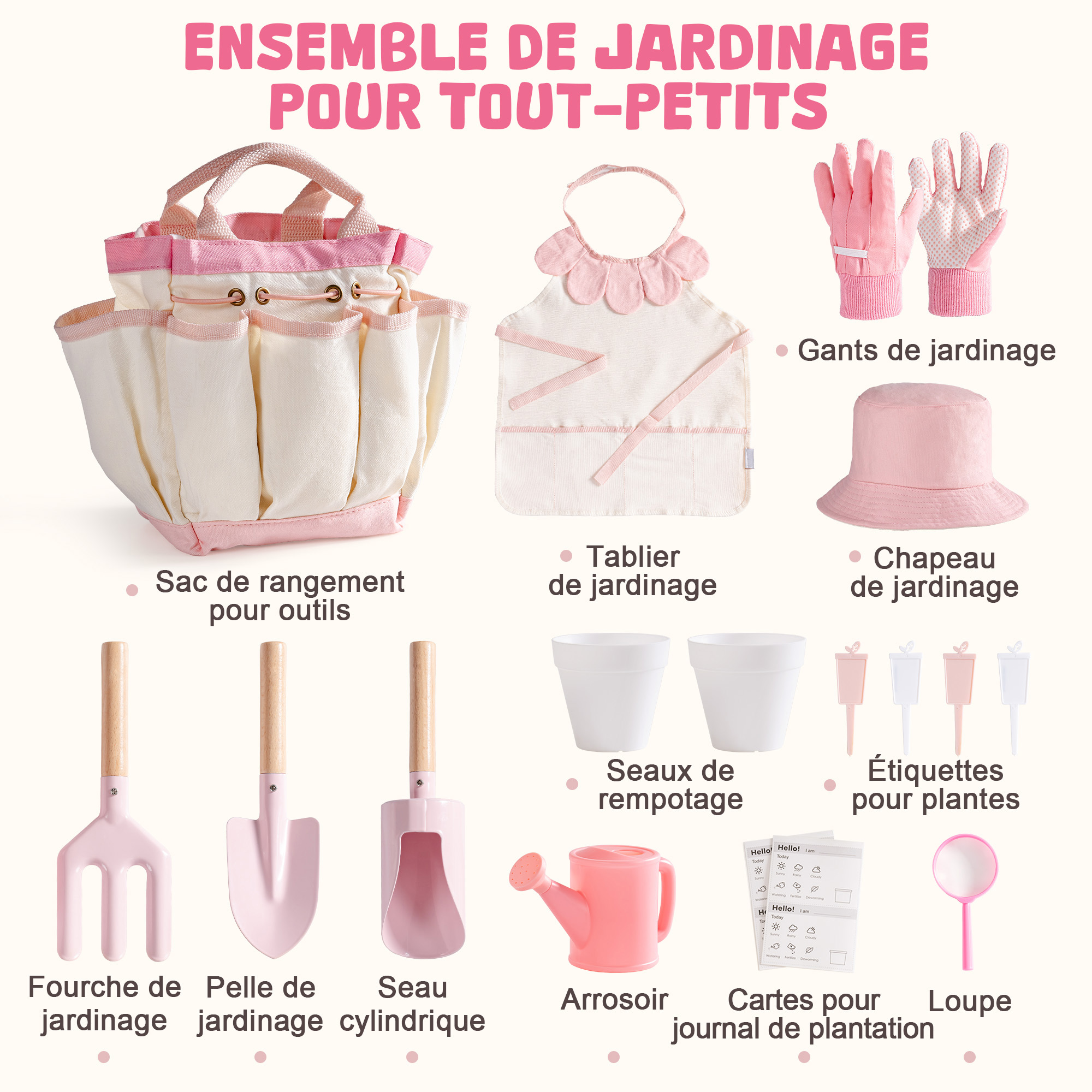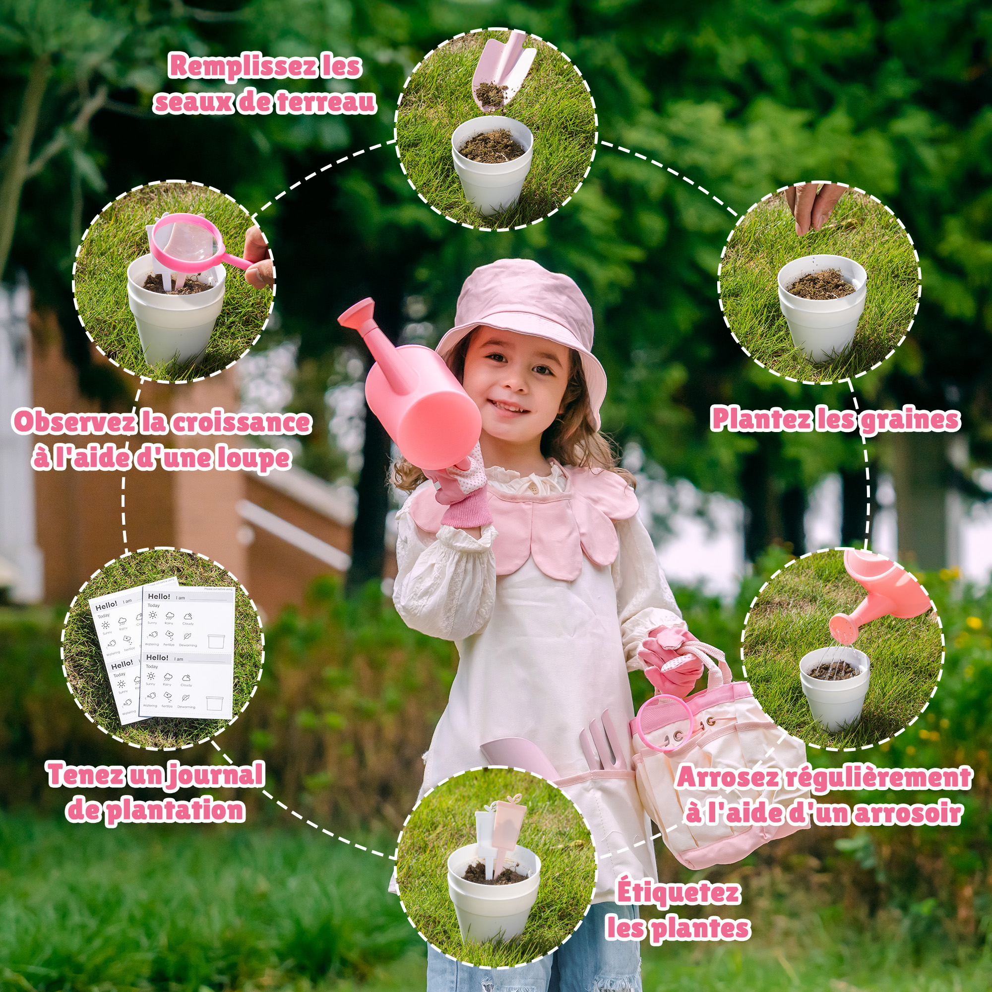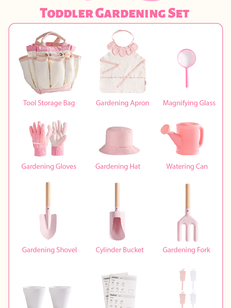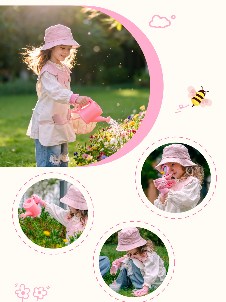 - Aventure de jardinage tout-en-un pour enfants – Le set de jardinage ROBUD pour enfants est conçu pour les petites mains avec de grandes imaginations ! Ce kit complet de jardinage pour enfants comprend un joli tablier, un chapeau de soleil, des gants, un arrosoir, un sac à outils, des pots, une pelle, une fourche, une loupe et des cartes de journal de plantation — tout ce dont votre enfant a besoin pour explorer la nature. Parfait pour les tout-petits de 3 ans et plus, ce set de jardinage pour enfants encourage l'apprentissage pratique, la créativité et la responsabilité tout en s'amusant à l'extérieur.