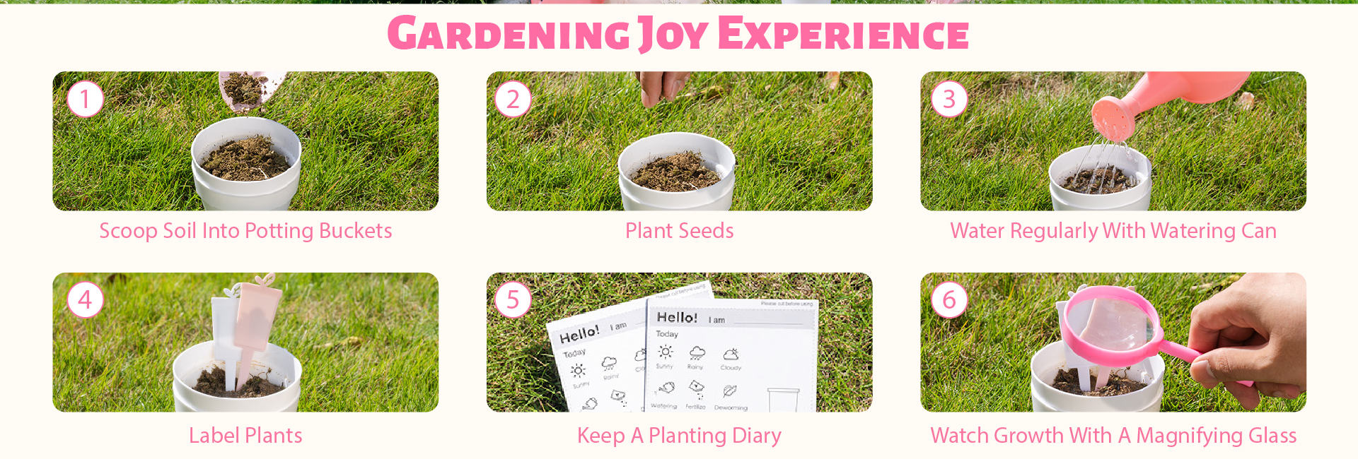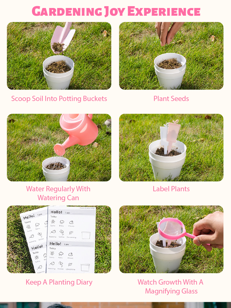 - Encourage la créativité et la responsabilité – Ce kit de jardin pour enfants enseigne aux enfants comment prendre soin des plantes, les arroser régulièrement et enregistrer leur croissance à l'aide des cartes de journal. À travers ce processus, le set de jardinage pour enfants cultive un sens de la patience, de l'accomplissement et de la sensibilisation à l'environnement. Regardez votre enfant s'épanouir avec confiance en cultivant son propre mini jardin avec ses outils de jardinage préférés et son set de jardinage pour tout-petits.
