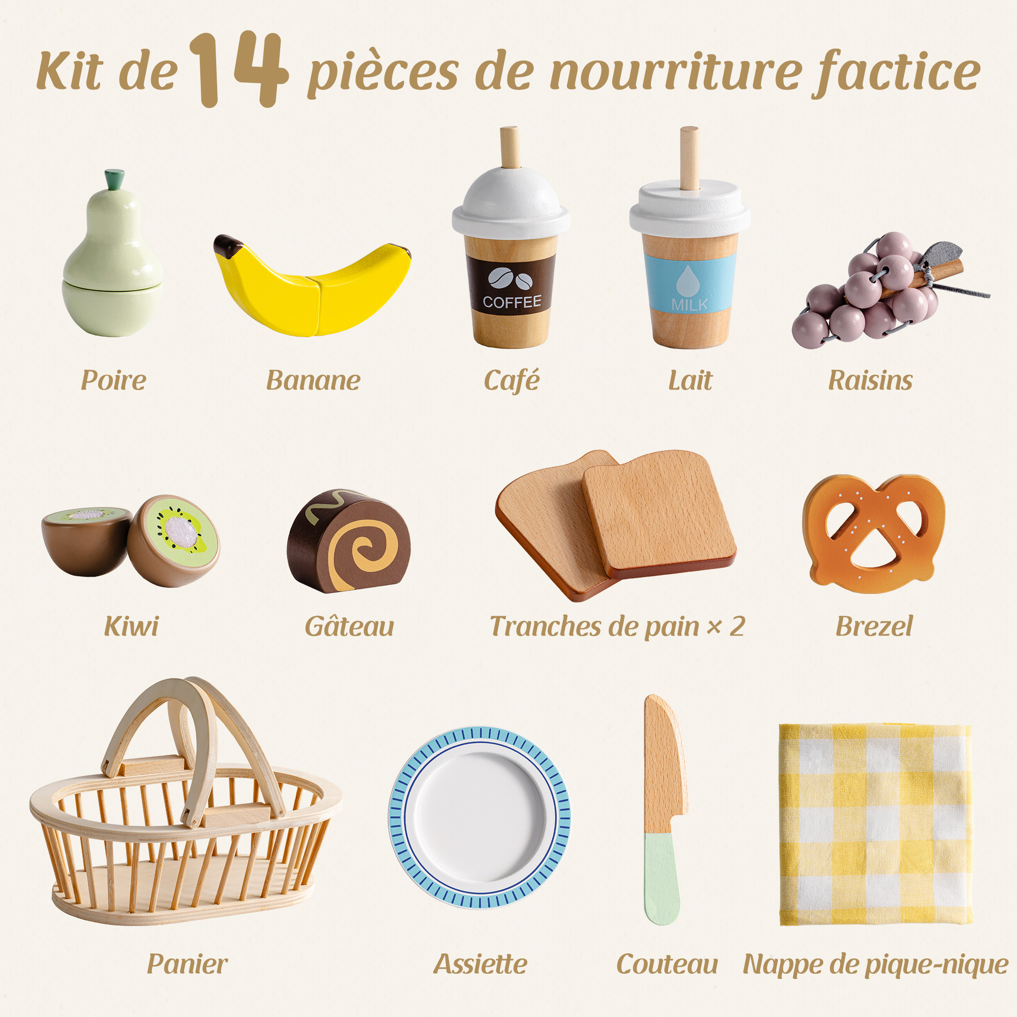 - Ensemble de pique-nique tout-en-un : Comprend tout ce dont les enfants ont besoin pour un amusant pique-nique imaginaire : panier, poire, raisins, kiwi, tranche de pain, banane, rouleau de gâteau, café, lait, assiette, couteau et nappe. Ensemble de départ parfait pour le jeu de rôle imaginatif.