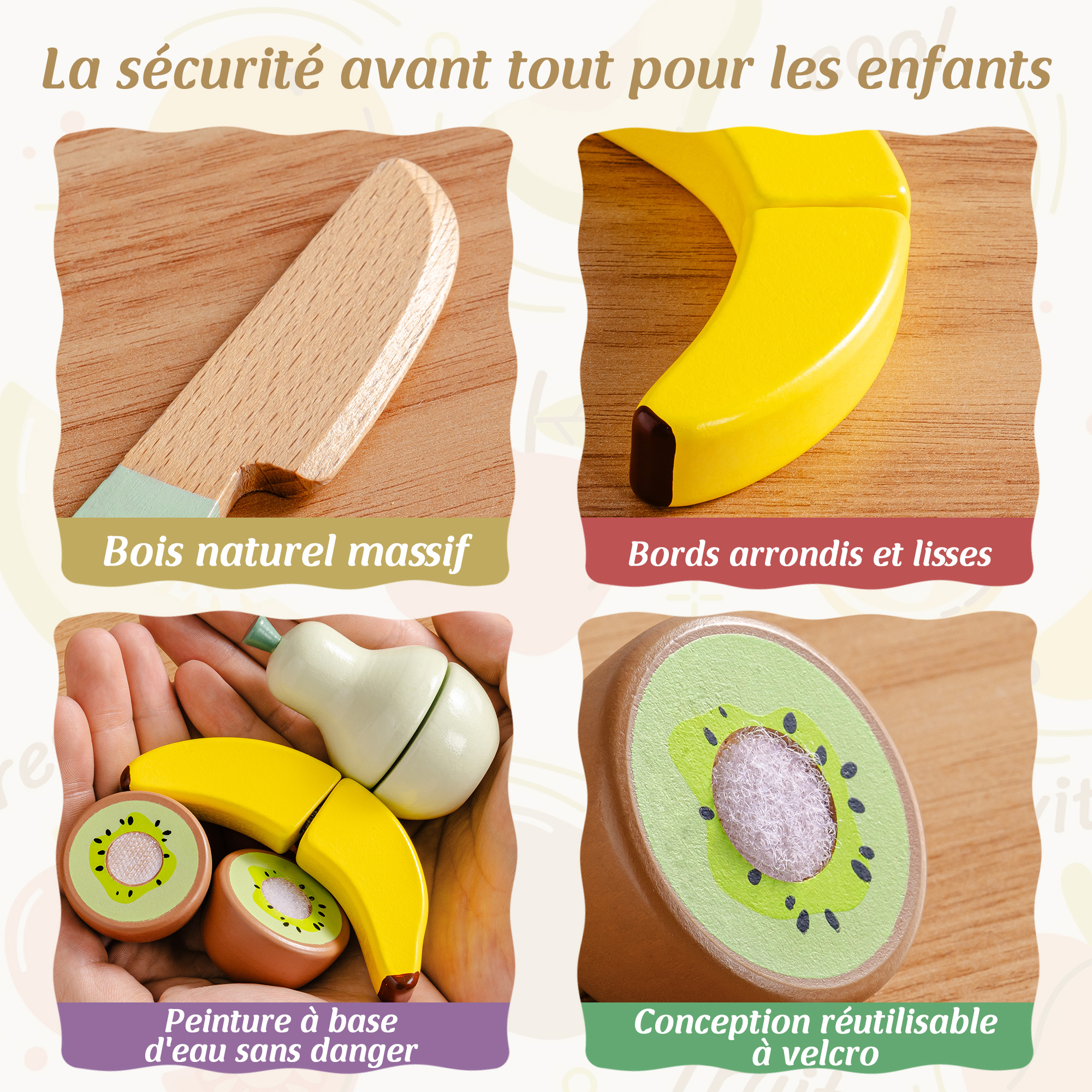 - Aliments à découper réalistes : Chaque fruit et pain peut être « découpé » et réattaché avec du Velcro, créant un son de découpe satisfaisant. Cette activité pratique aide les enfants à pratiquer la coordination, les compétences motrices fines et l'indépendance.