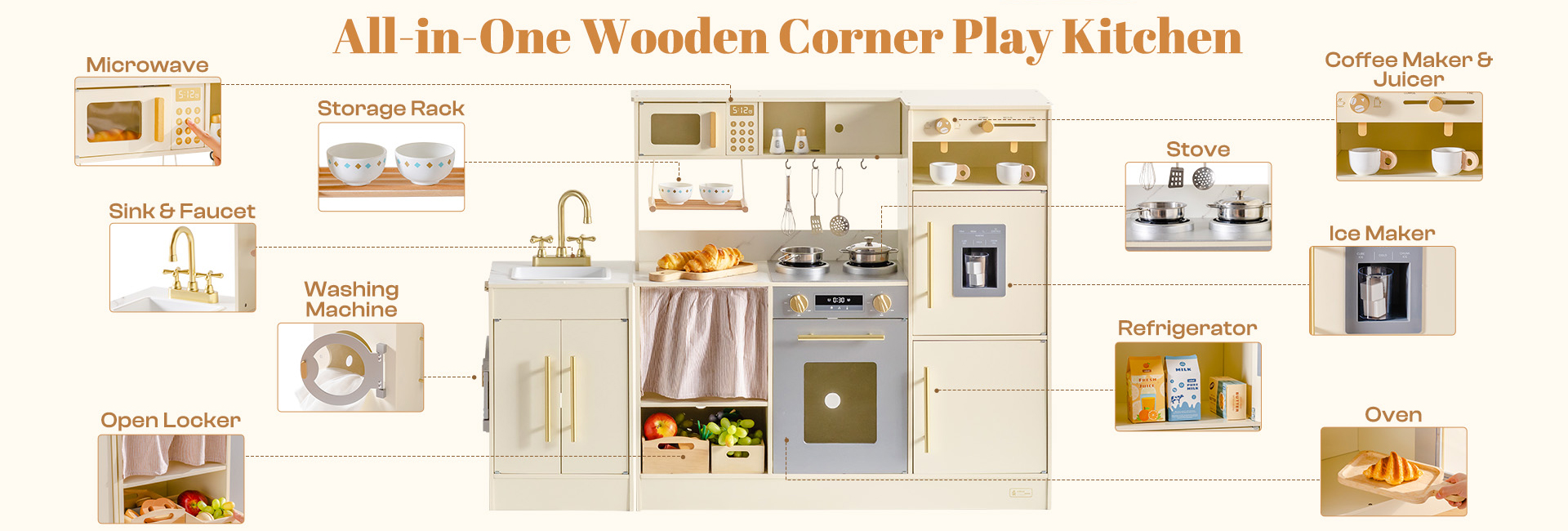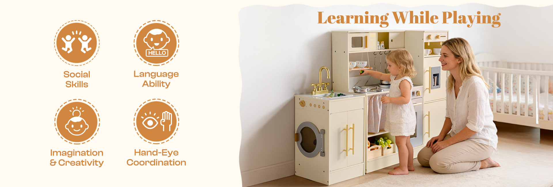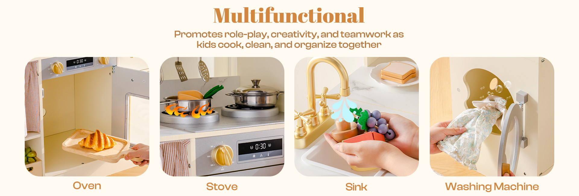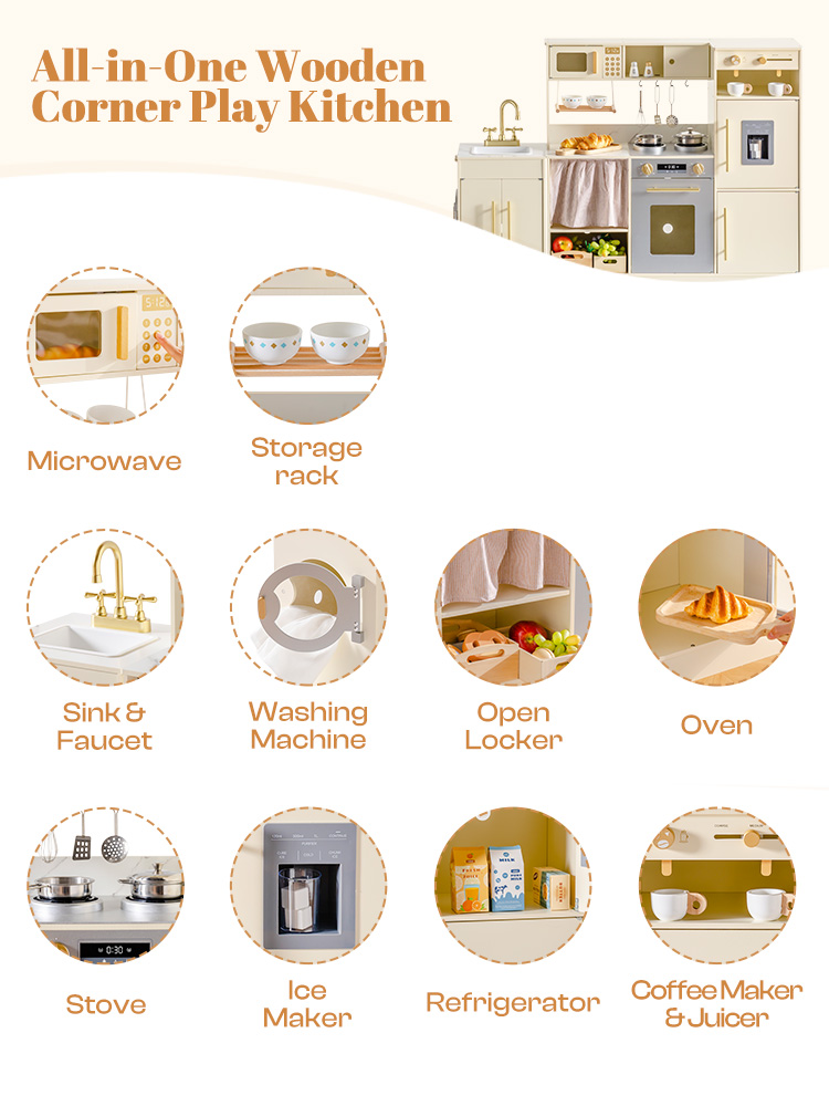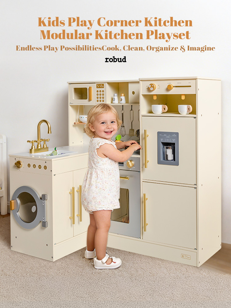 DEUX FORMES, DISPOSITION FLEXIBLE : Cet ensemble de cuisine en bois présente un design combiné et tout-en-un en coin - réarrangez facilement en plusieurs configurations pour s'adapter aux petits recoins ou aux espaces de jeu ouverts. Parfait pour les enfants de 3 ans et plus, il transforme n'importe quel espace en une cuisine réaliste pour le jeu de rôle, s'intégrant parfaitement à votre décoration intérieure tout en maximisant la flexibilité de la salle de jeux.