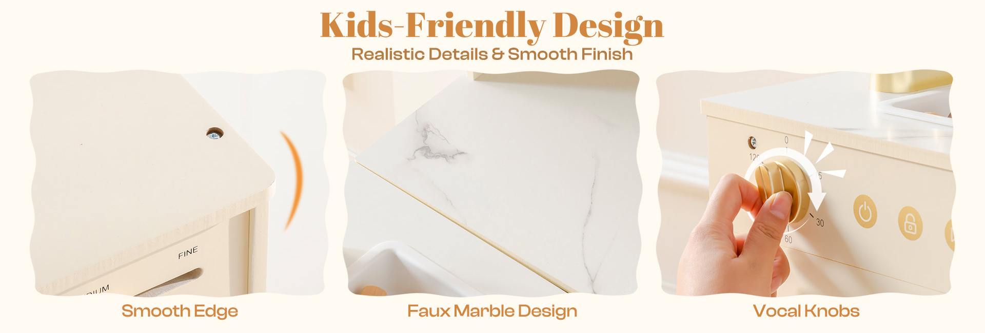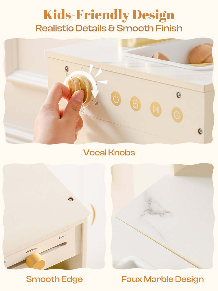 DESIGN AMICAL POUR LES ENFANTS : La cuisine jouet est fabriquée en bois robuste et a été polie. Sa surface est lisse et exempte d'échardes. Les bords arrondis, les poignées faciles à saisir et les composants anti-casse garantissent sa longue durée de vie - ce qui la rend très adaptée aux enfants de plus de 3 ans. La palette de couleurs crème neutre maintient une apparence à la mode dans n'importe quel espace de jeu.