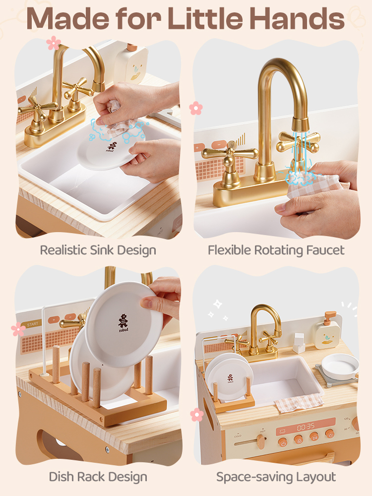 Conception finement élaborée : Le lave-vaisselle jouet ROBUD est imprégné d'un savoir-faire exquis et d'une créativité illimitée. De son apparence mignonne à ses fonctions réalistes, chaque détail a été soigneusement sculpté pour que les enfants se sentent à la mode et réconfortés en jouant.