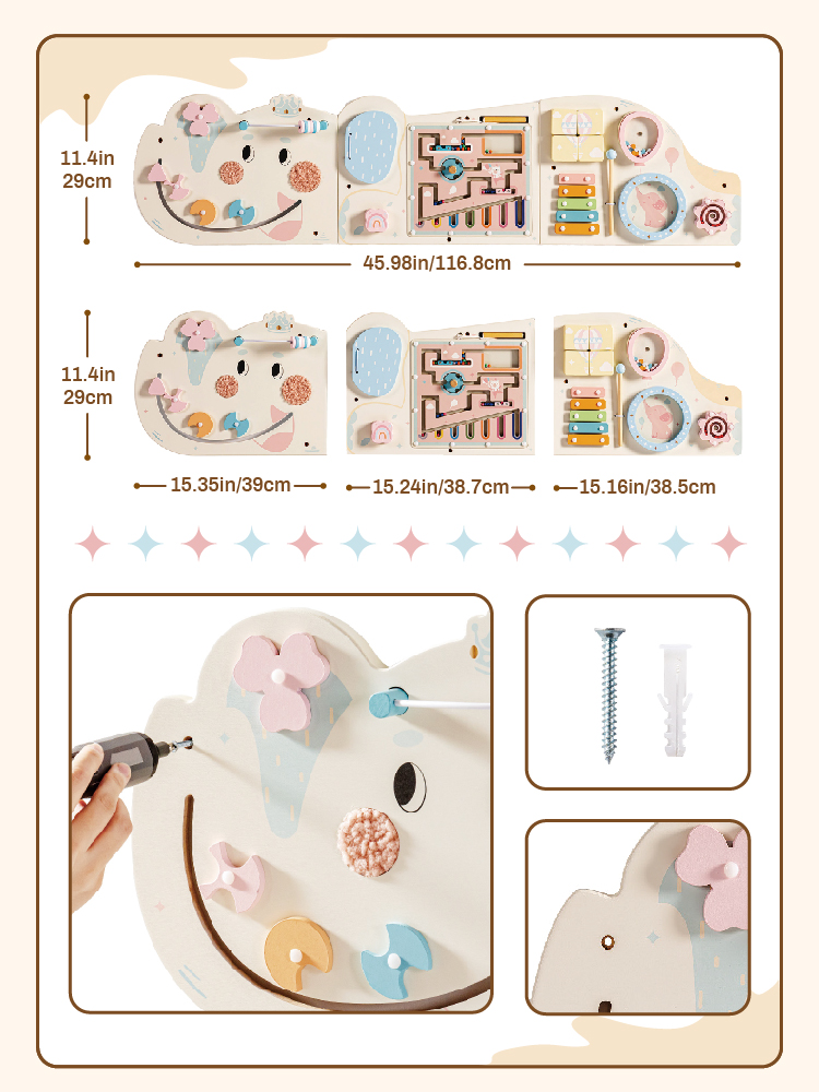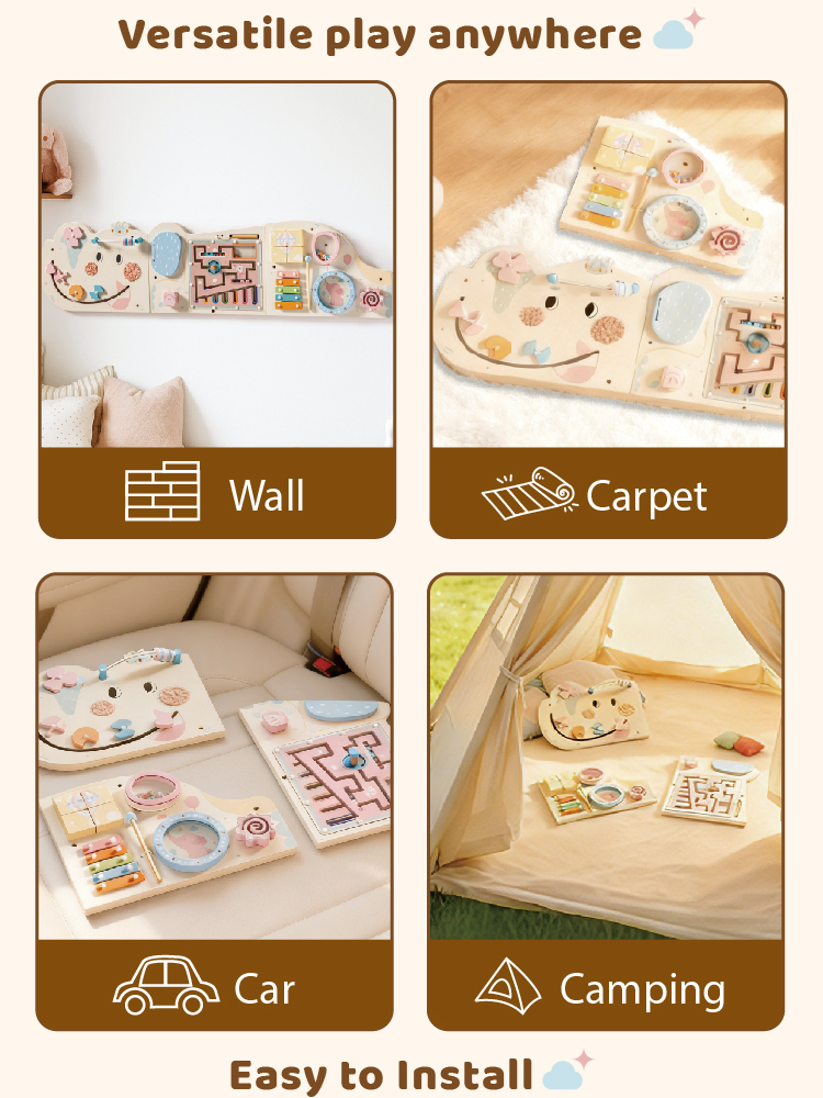 Facile à installer - En suivant des instructions d'installation simples, ce tableau d'activités se fixe facilement à n'importe quel mur. Sa construction durable et sa surface facile à nettoyer rendent l'entretien un jeu d'enfant, garantissant un environnement de jeu sûr et hygiénique pour les enfants.
