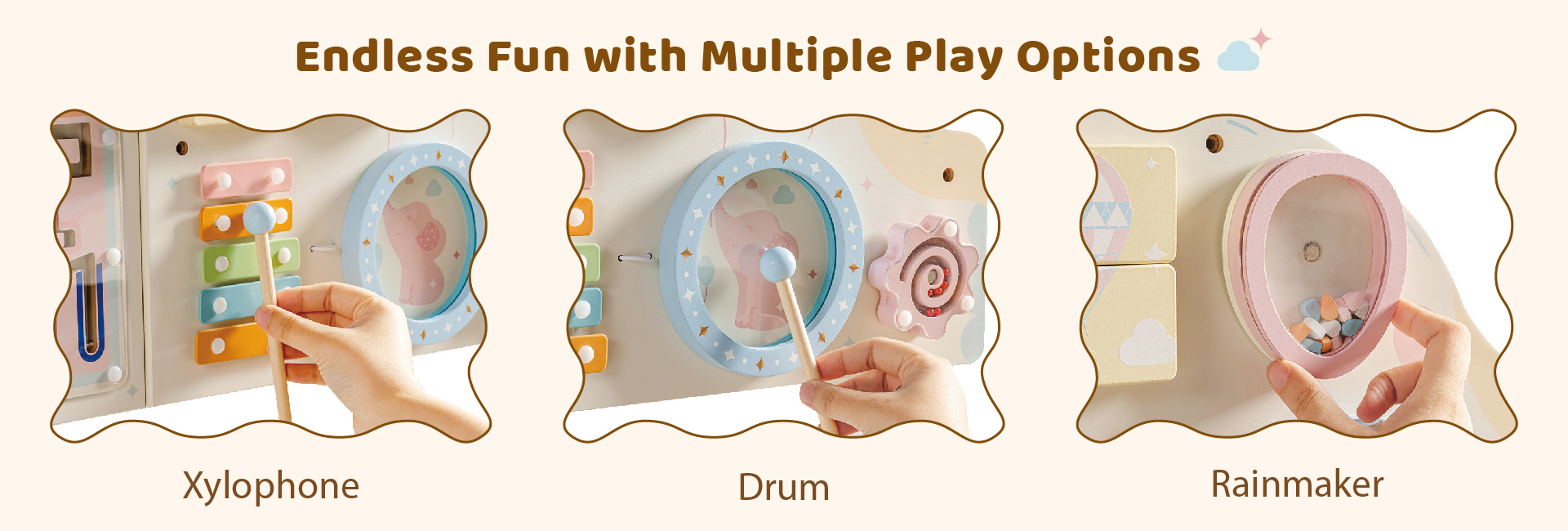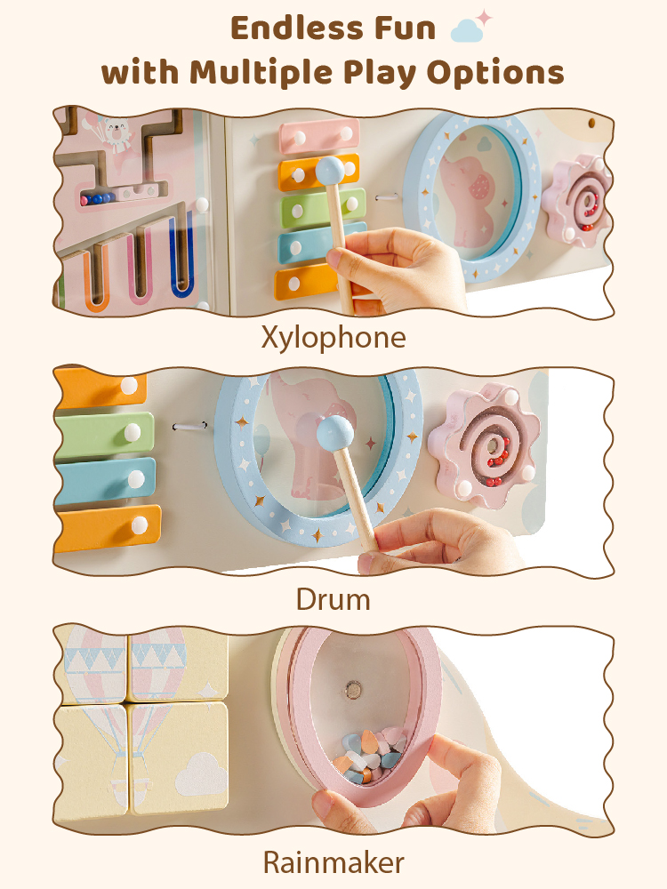 Cream Elephant Wall-Mounted Busy Board - Ce tableau d'activités polyvalent propose une variété d'activités amusantes, y compris un labyrinthe à perles rotatif, des blocs à assortir, des engrenages en forme, un labyrinthe à perles magnétiques, un xylophone à cinq tons, et plus encore. Chaque activité est conçue pour stimuler un aspect différent du développement de l'enfant, ce qui en fait un outil éducatif idéal pour tout espace de jeu.
