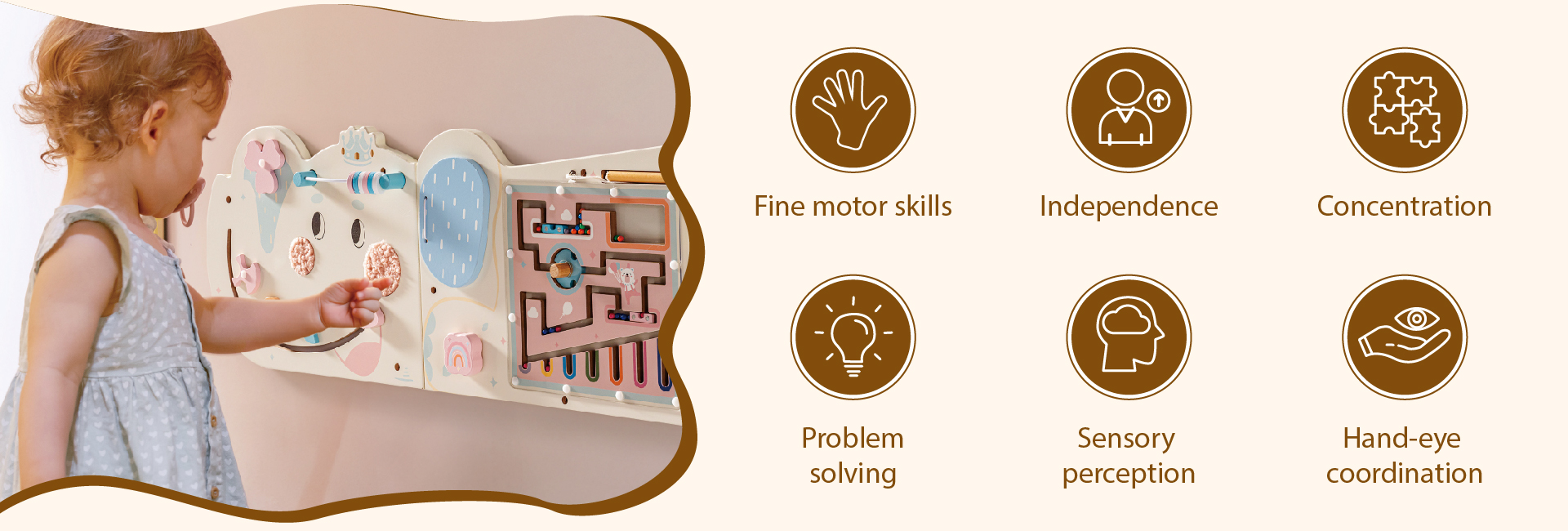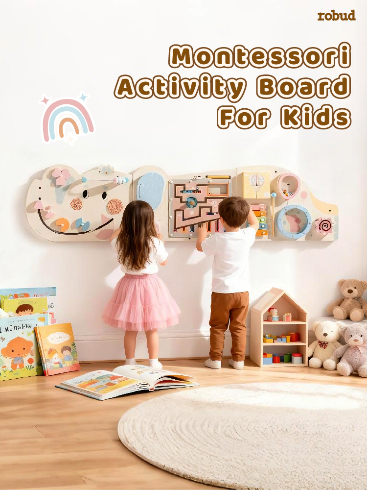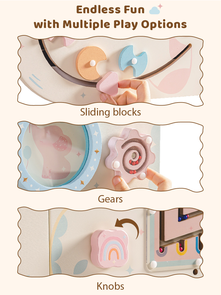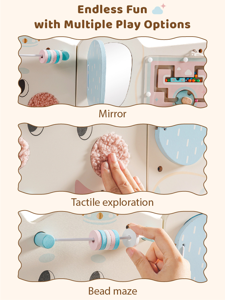 Matériaux de haute qualité et sûrs - Ce tableau d'activités est fabriqué en bois de haute qualité et peint avec de la peinture non toxique, ce qui est non seulement sûr et fiable mais aussi durable. Le système de montage mural sécurisé garantit que le tableau est fermement fixé, offrant une aire de jeu stable et sûre pour les enfants.