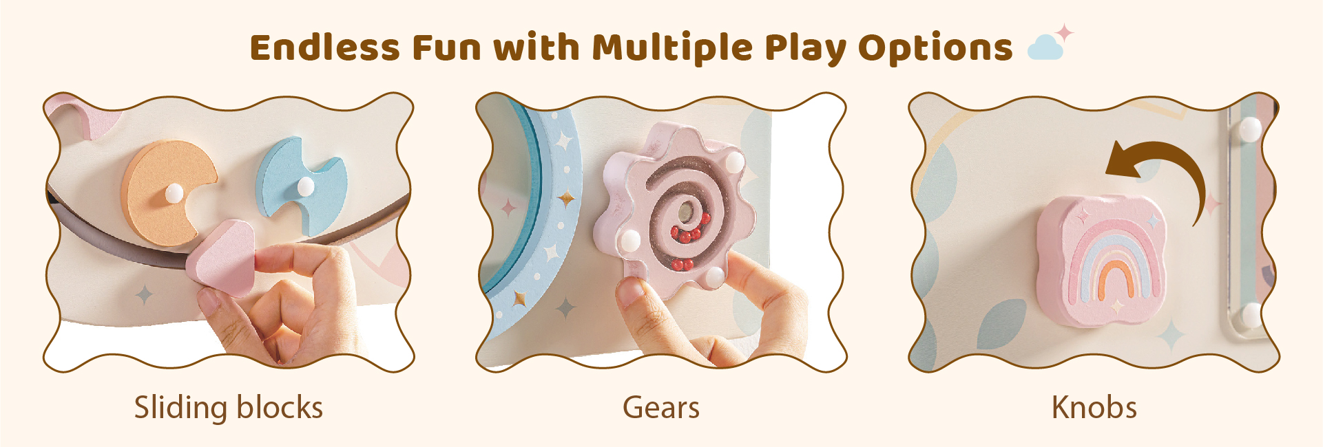 Encourage la créativité et la résolution de problèmes - Les activités sur le tableau d'activités, telles que le labyrinthe à perles magnétiques et les blocs à assortir, encouragent la pensée créative et la résolution de problèmes. Le labyrinthe à perles rotatif et les engrenages circulaires aident également à développer la motricité fine et la coordination œil-main.