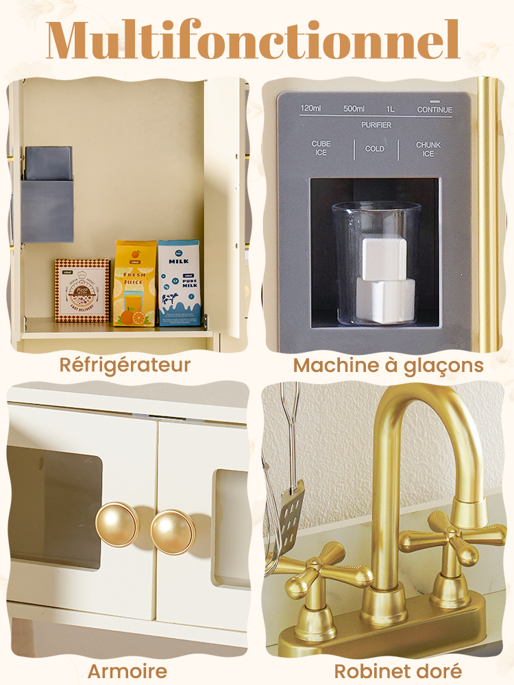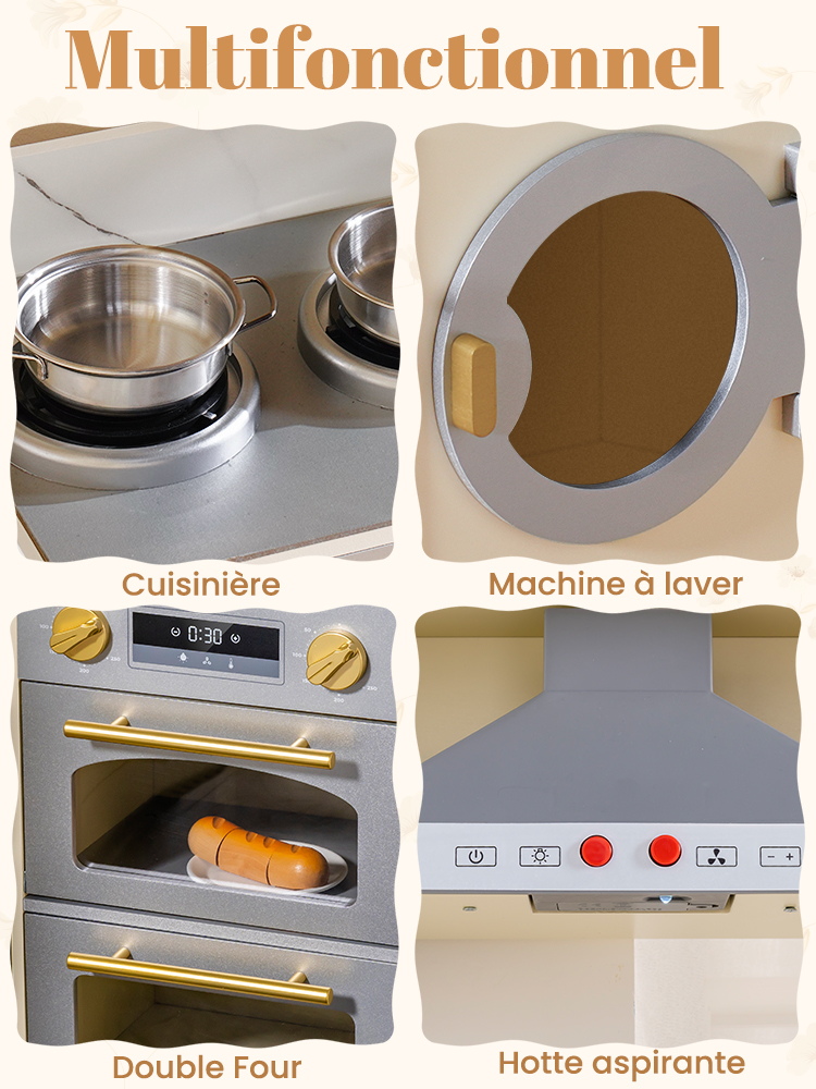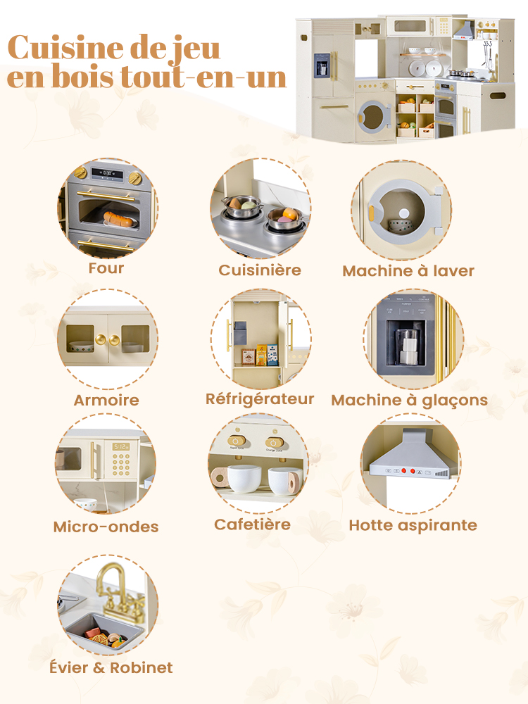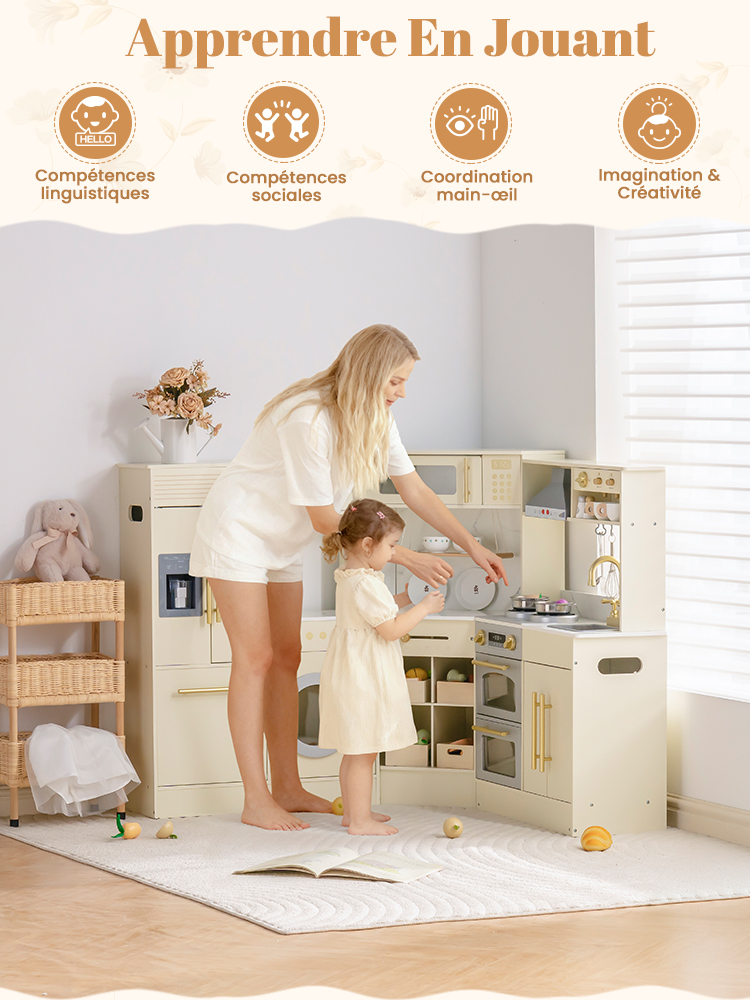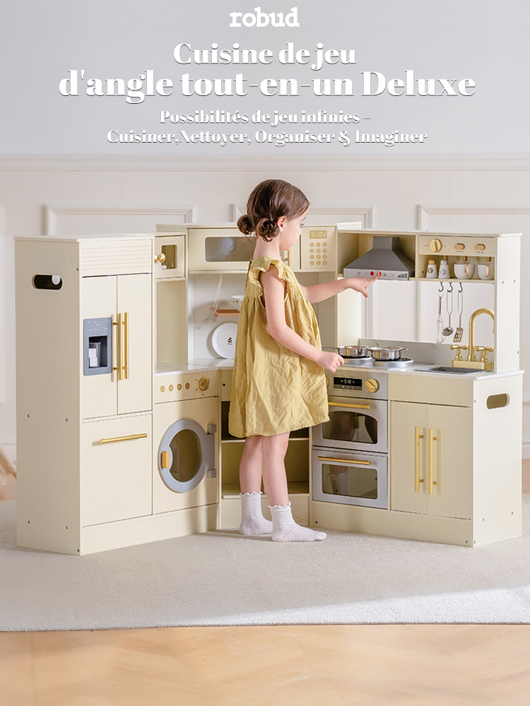 - ENSEMBLE DE CUISINE EN BOIS TOUT EN UN : Cette cuisine de jeu d'angle deluxe combine un réfrigérateur, un four, un ensemble de jeu de buanderie et un cabinet de rangement, fabriqués en bois robuste. C'est le centre de jeu de simulation parfait pour les enfants de 3 ans et plus, offrant une expérience de cuisine réaliste à travers plusieurs zones fonctionnelles.