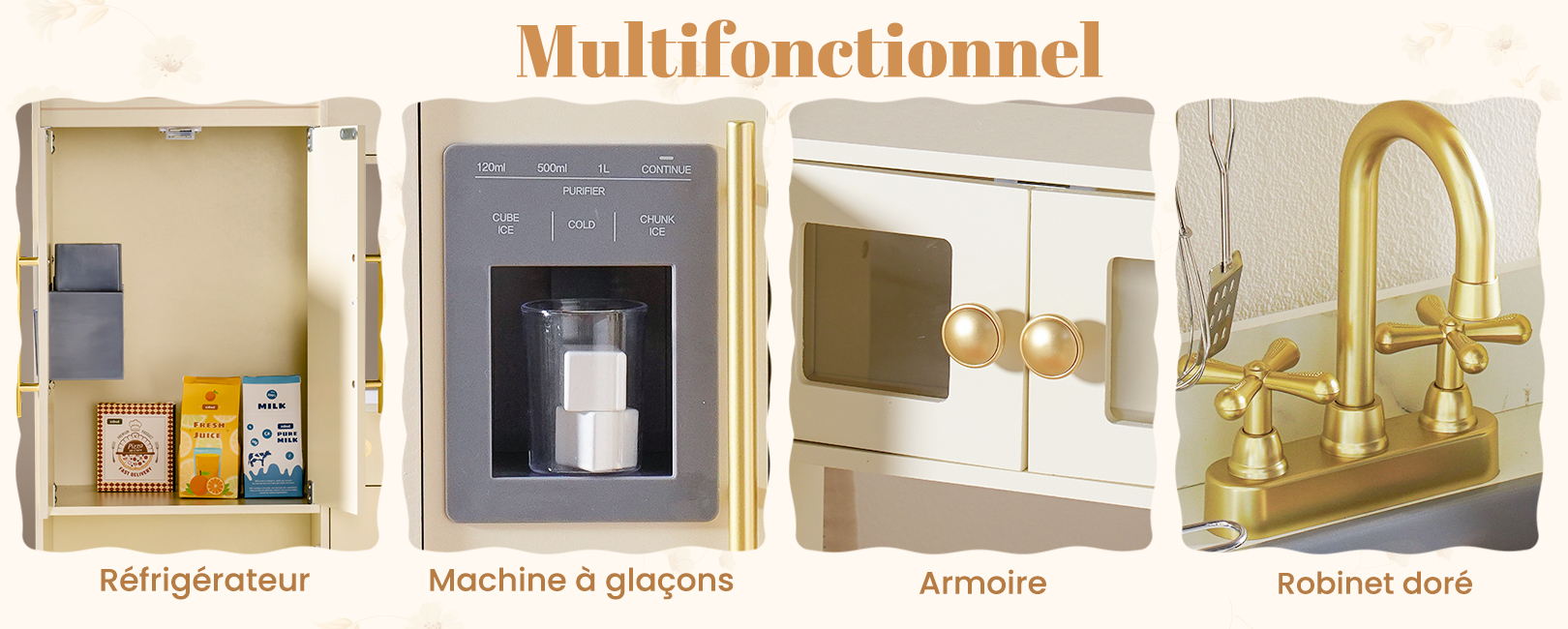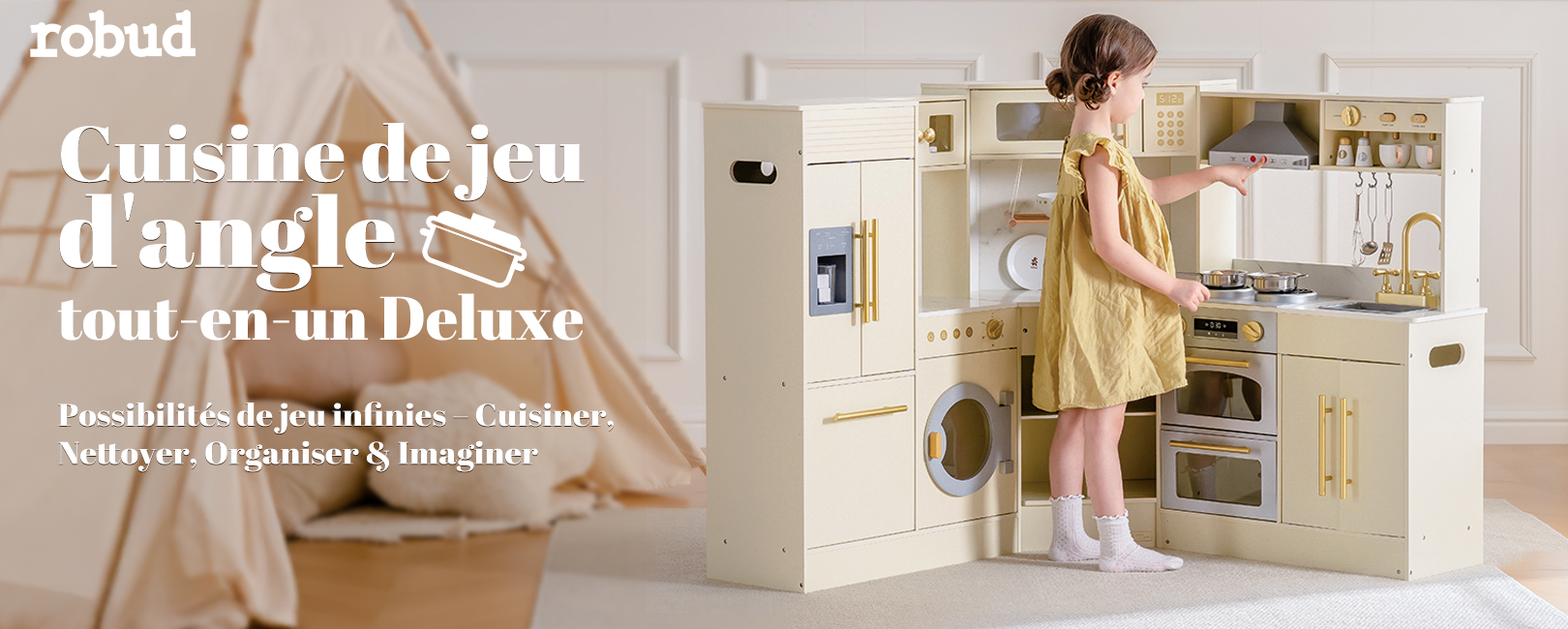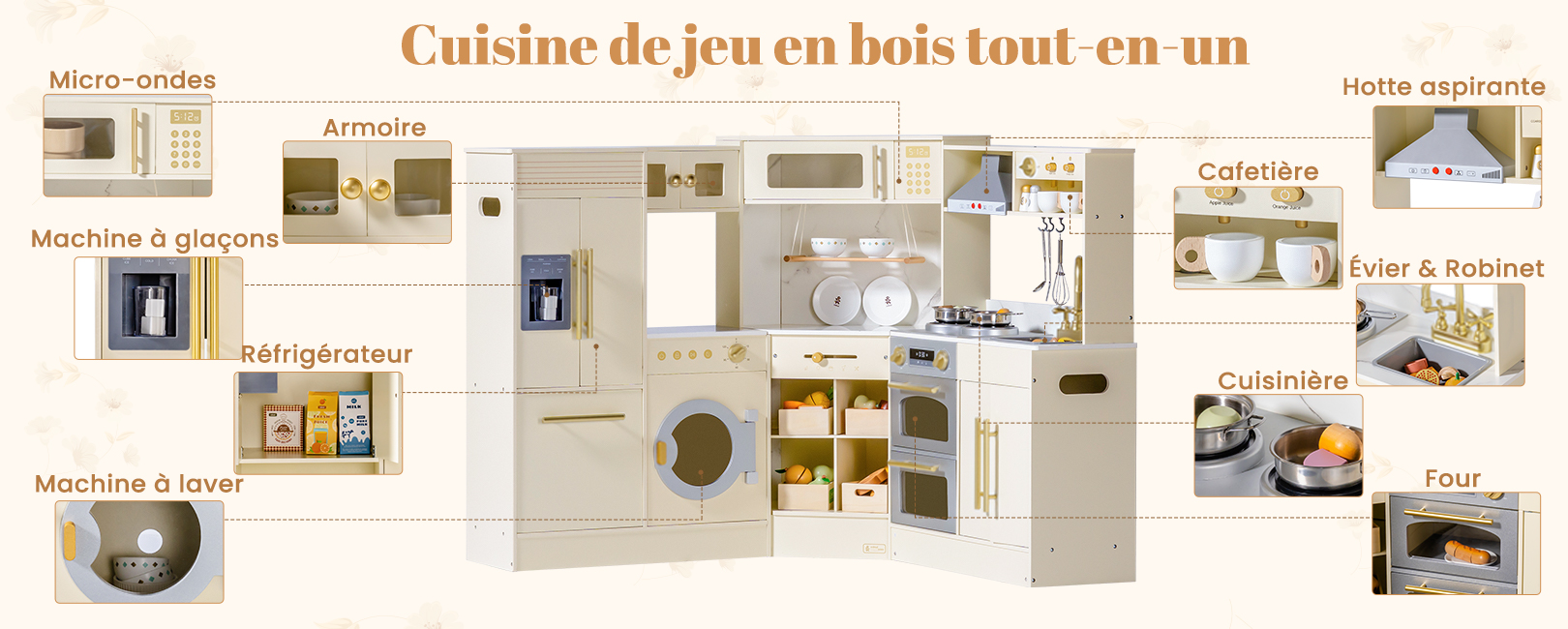 - ENSEMBLE DE CUISINE EN BOIS TOUT EN UN : Cette cuisine de jeu d'angle deluxe combine un réfrigérateur, un four, un ensemble de jeu de buanderie et un cabinet de rangement, fabriqués en bois robuste. C'est le centre de jeu de simulation parfait pour les enfants de 3 ans et plus, offrant une expérience de cuisine réaliste à travers plusieurs zones fonctionnelles.
