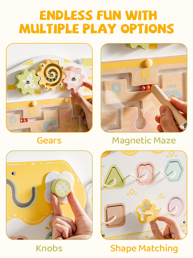 Stimule la créativité et la résolution de problèmes - Les diverses activités de ce tableau de jeu éducatif, telles que le labyrinthe à perles magnétiques et le jeu d'association de blocs, stimulent la pensée créative et les capacités de résolution de problèmes des enfants. Le labyrinthe à perles tournant et les engrenages circulaires aident également les enfants à développer leurs compétences motrices fines et leur coordination œil-main.