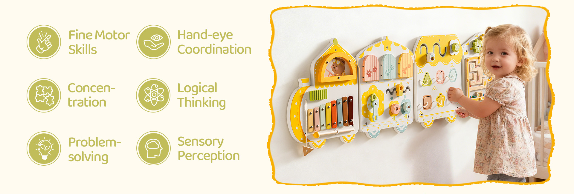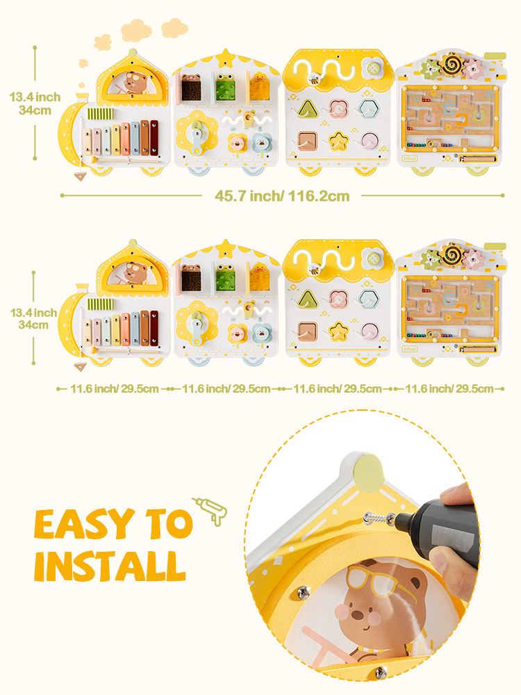 Tableau de jeu éducatif mural en forme de train - Ce tableau de jeu éducatif multifonction comprend une variété d'activités amusantes telles qu'un labyrinthe à perles tournant, un jeu d'association de blocs, des puzzles à engrenages, un labyrinthe à perles magnétiques, un xylophone, et plus encore. Chaque activité est conçue pour promouvoir différents aspects du développement des enfants, ce qui en fait un outil éducatif idéal pour tout espace de jeu.