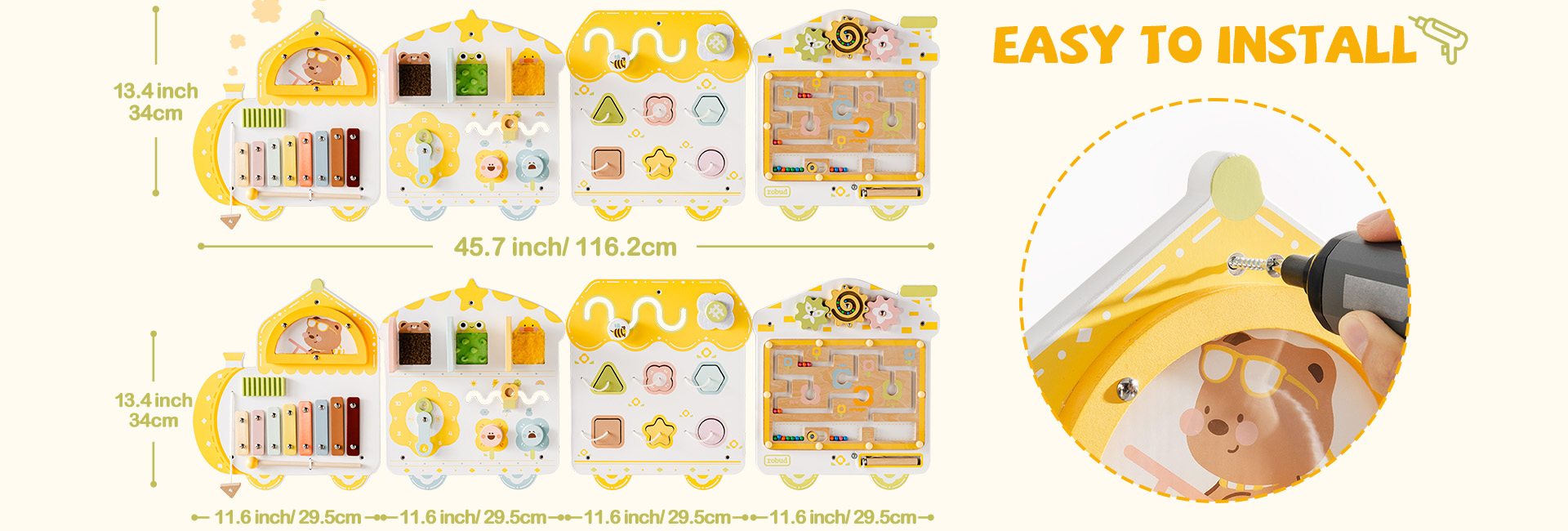 Installation facile - En suivant les instructions d'installation simples, ce tableau de jeu éducatif peut être facilement installé sur n'importe quel mur. Sa construction durable et sa surface facile à nettoyer rendent l'entretien un jeu d'enfant, garantissant un environnement de jeu sûr et hygiénique pour les enfants.